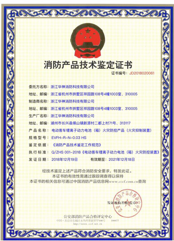 2018年12月獲得公安部消防產(chǎn)品合格評定中心頒發(fā)的《消防產(chǎn)品技術(shù)鑒定證書》,華神消防自主研發(fā)的電動客車鋰離子動力電池(箱)專用的熱氣溶膠滅火裝置,獲得公安部消防產(chǎn)品合格評定中心相關(guān)專家的認可,成為目前擁有消防產(chǎn)品技術(shù)鑒定證書的單位之一。